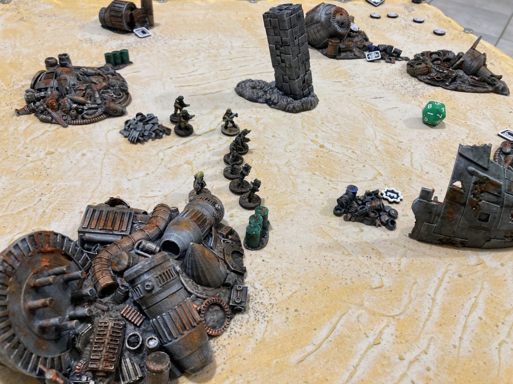 For the battle I used a desert roll mat I had made myself with acrylic spackle, paint and fine sand. I had severe issues with it in the past with sand shedding everywhere, but I re-coated with floor polish and it’s much better now.